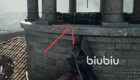 维纶沃兹房顶的宝箱有4个,玩家获取这宝箱时要按着路线顺序走,才是最节省时间和方便的。当我们来到如图标示的位置后,爬上2楼阳台的位置,看到梯子然后顺着梯子爬到屋顶,之后跳到这个圆台地方会发现3个宝箱。
