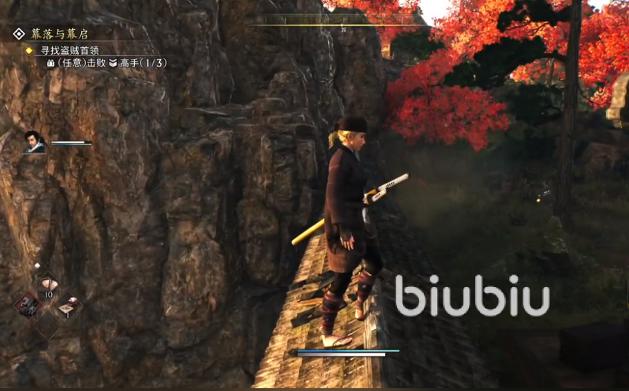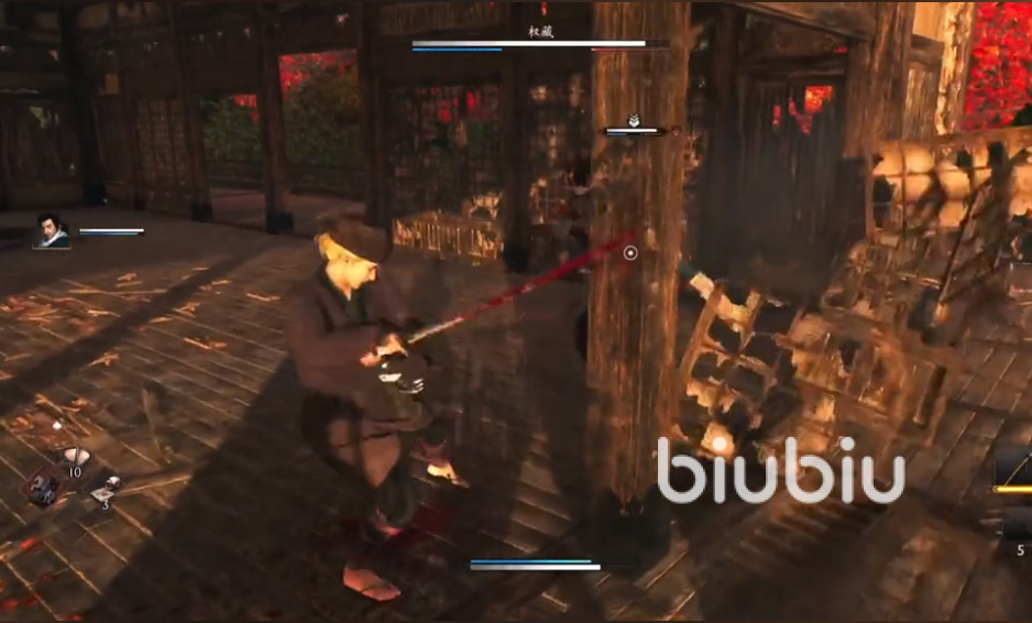 在打掉台阶上的高手小兵之后,可以爬上建筑群的屋顶,然后一直往里面走,找到最大的房子,可以看到有人在这里把守,使用弓箭远程攻击,然后再跳下去近战,就可以击败这些高手了。然后把外围的怪物都清理掉之后,就可以来到最大的屋子里面,看到最终的盗贼首领权藏了。上去拉仇恨开启战斗,这个怪动作有点慢,而且还有点笨重,打的时候躲掉他的武士刀斩击,就可以趁着他招式后摇的硬直时间,专攻他的下盘命中率就会高很多。