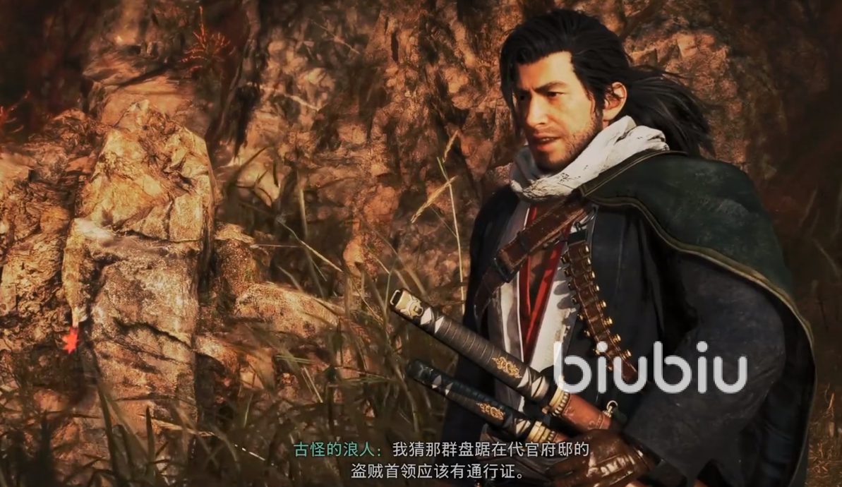 把村子里面的作乱者击杀之后,就可以跟村长交谈了,他说这里有强盗抢走了东西,都放在了山丘上的洞窟里面,这些物品里面就有通行证。得到提示前往该区域,会遇到一个古怪的浪人,一直跟着他就行了。