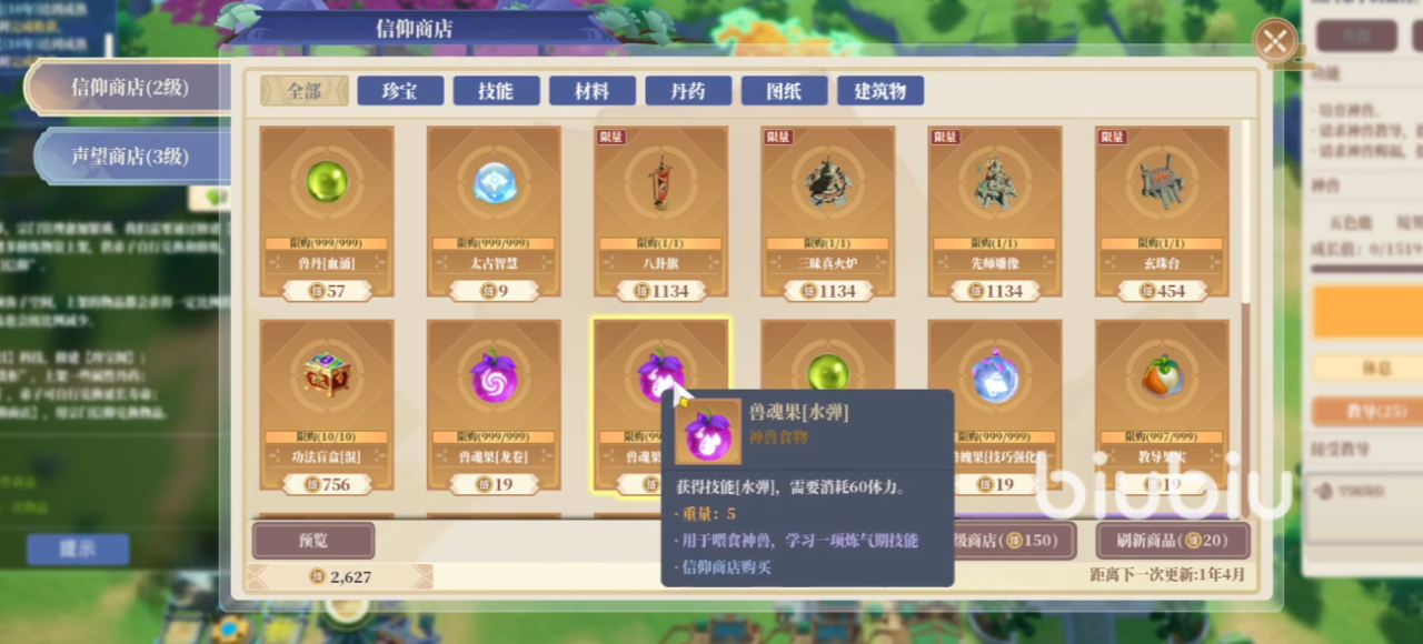 神兽有着自己的属性和技能,我们想要培养神兽的话,就需要解锁信仰商店中的神兽食物,购买神兽食物后给神兽服下,即可提升对应属性。神兽在不同的等级使用的技能也不同,每个境界可以带2个技能,分为主动技能和被动技能。因此想要提升神兽的增添技能,就可以在信仰商店内购买技能果实来实现,当然也购买果实给神兽升级以及提升神兽的属性,另外神兽还会带有赐福技能,可以给宗门子弟带来属性的提升。