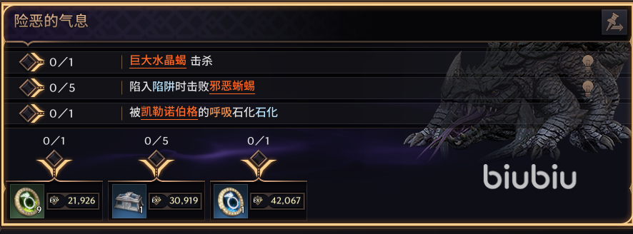 最后是被精英敌人凯乐诺伯格的呼吸石化,这个敌人在遗弃的石匠村,玩家在与它交战时,记得去主动接一下它的石化技能就可以完成任务,至于需不需要击杀其实无所谓。以上几个目标都已经完成了,任务也就结束了。