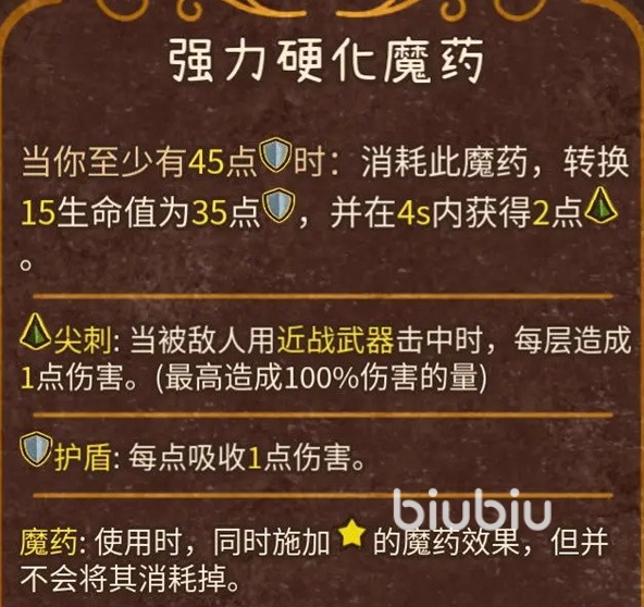 如果你拿到石头徽章,通过每回合获得的石头可以合成强力硬化魔药,在你有至少45点护盾时:消耗此魔药,转换15生命值为35点护盾,并在4s内获得2点尖刺。尖刺效果让你当被敌人用近战武器击中时,每层造成1点伤害,最高可造成100%伤害的量。护盾则会让自己每点吸收1点伤害,并且使用过程中若是同时施加星级的魔药效果,护盾的效果是不会被消耗掉的。