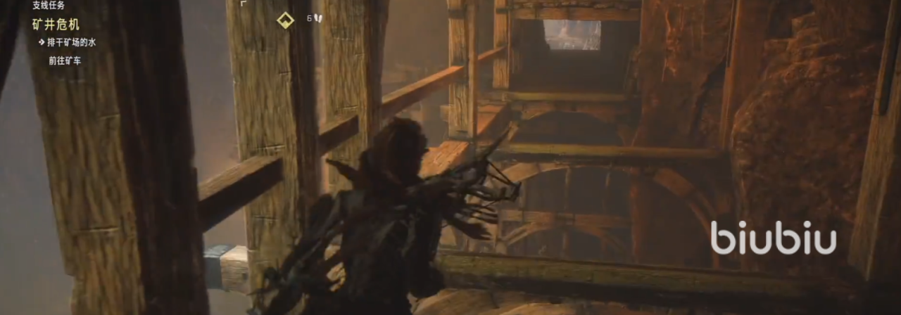 经过简单的查看后有一个工人腿部受到了伤害,同时矿洞内的水流被某些东西堵住了,我们需要找到炸药将堵塞物炸开,水流才能排出去。于是我们来到右侧的平台后,继续下水向前游一段,找到梯子后出水再次爬上平台来到矿车这里,利用投拉器将木质轨道修复完成后,点燃炸药推动矿车,将堵塞物炸开,排空水流就能救出被困的矿工了。最后我们救出矿工离开矿洞与柯文德对话即可完成任务。