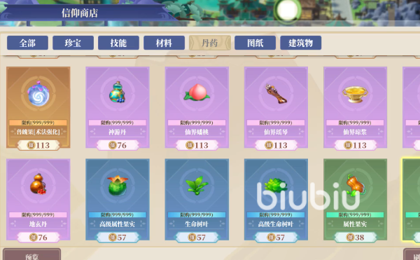 在积累到一定的信仰值之后,我们可以点击下方的交易选项找到信仰商店,在这个商店里面售卖着许多的珍宝、技能、材料、丹药、图纸和建筑物。比如可以增加寿命年限的固元丹,就可以在这个商店里面用信仰点数进行兑换。