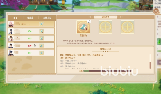 合欢台建造完成后,我们点击建筑选择想双修的两个角色,然后点击邀请双修。双修初始一级需要50点经验,每半年的双休可以增加18点,因此一级需要50点,二级需要80点,三级需要120点。开始修习的时候一级就可以了,双修完成后对副本战斗类型的英雄,提升还是比较大的。因为随着双修次数的增加,我们的阴阳诀也会不断提升,比如一级的时候是物理攻击+5,气血上限+10%,移动速度+5,二级的时候就会解锁法术攻击+5。