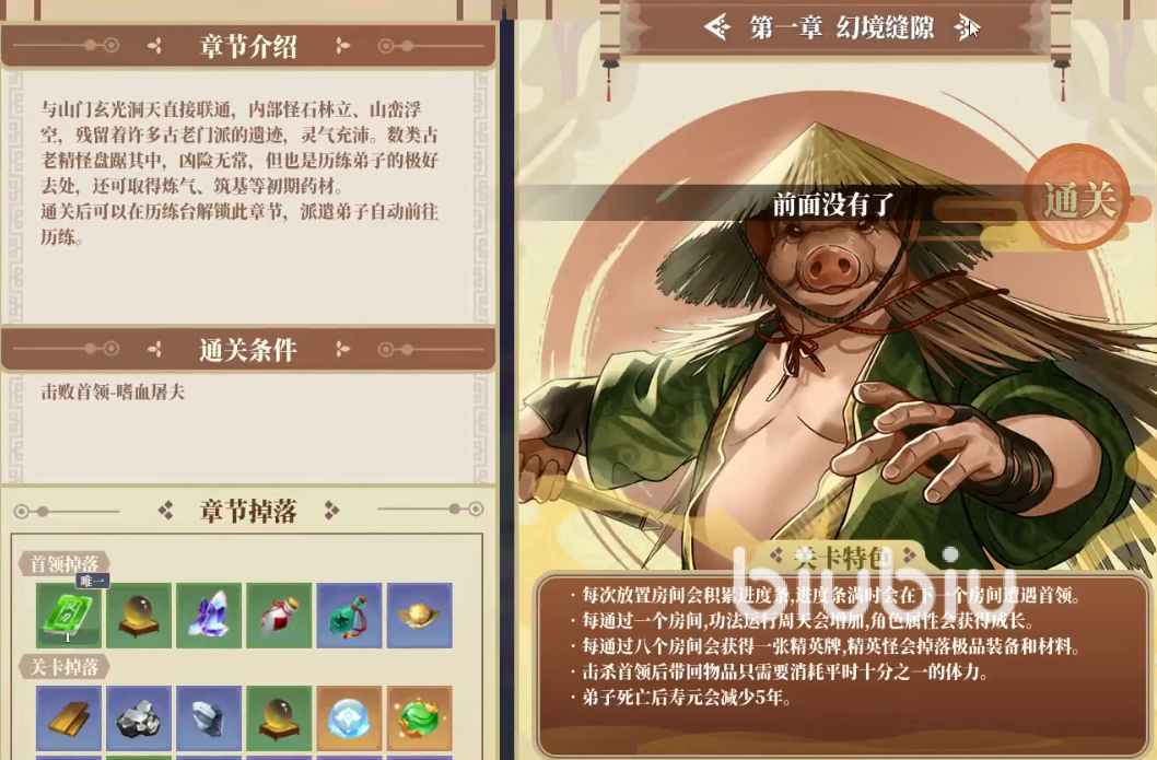 这款游戏从本质上来说,是一款沙盒题材的经营游戏,只不过用了修仙的题材。游戏有一个简短的章节主线,如果仅仅是说章节的通关,那很简单就是每一张的首领都需要打败,拿完所有的道具就行了,不过很显然章节的通关并不代表直接把整个游戏打通了。