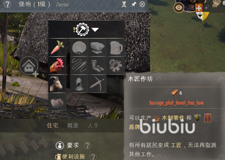 最为简单且常见的方法就是利用地堡,这是游戏中重要的军事设施之一,玩家可以通过升级地堡来解锁更高级的武器制造能力,当地堡住宅升级到2级,且房子足够放下生产设施以后,玩家们就能进行制作了。同时制作的武器不一样所需的要求也是不一样的,比如盾牌类就得通过木匠的作坊制作,此时我们还要将所有的居民变成工匠,无法再指派其他类型的工作。