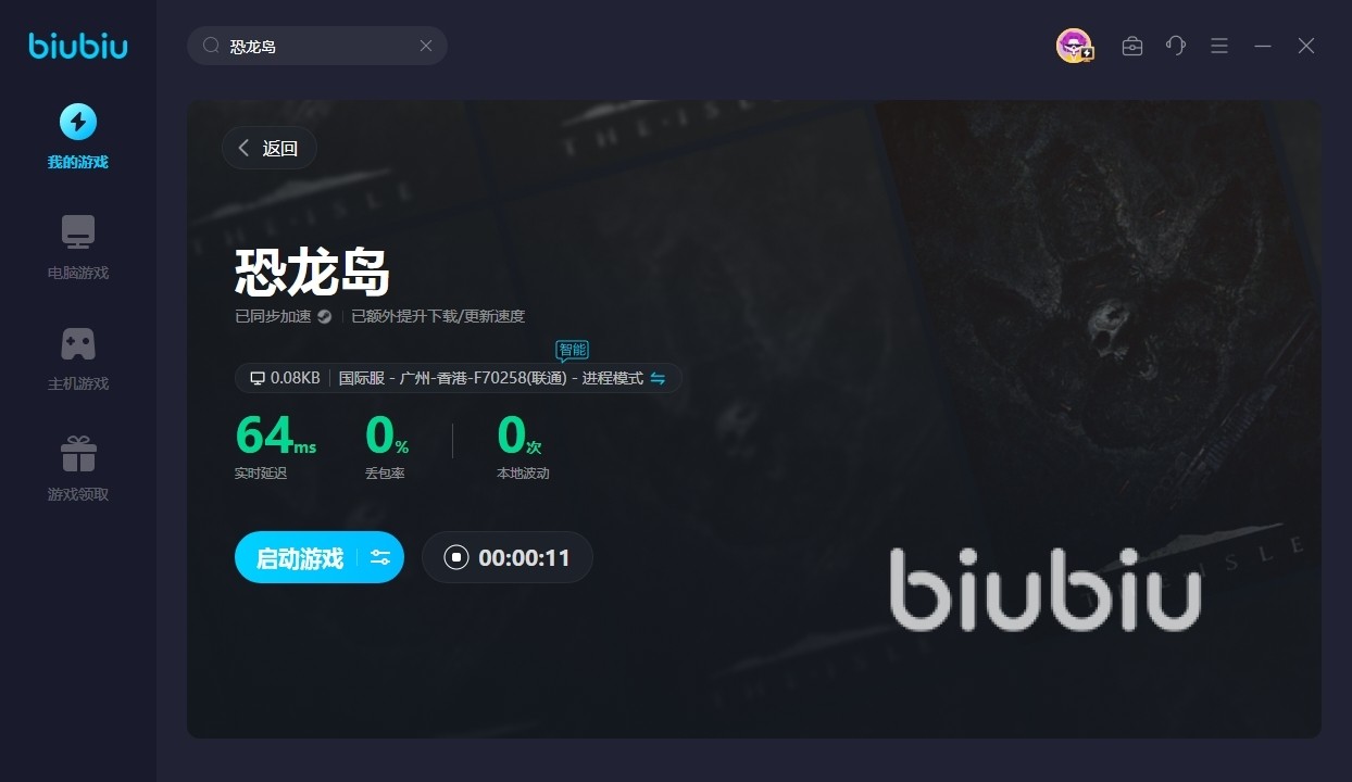 而且新用户也完全不用担心自己不会使用,biubiu的加速操作非常的简洁。我们在下载好平台之后,直接在其首页搜索恐龙岛,找到相应的游戏,将其添加到主界面之后就可快速开启加速服务了。加速前玩家可以自由选择区分,有海量的节点,如果不知道怎么选择节点,直接点击智能节点加速就可以了。后续会为我们直接更换延迟更低的节点,如果不想体验了,也可以直接在详情界面停止加速,方便又简单。