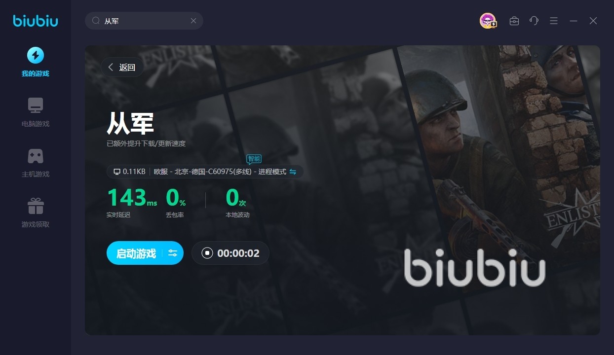 它的加速方法非常的简洁,没有过多复杂的步骤,在搜索到从军游戏之后,将其加入到我们的游戏库内开启一键加速就可以了,能够直接为我们构建专属加速通道,享受电竞级别的网速效果,直接将延迟降低到最低范围之内,这样参与游戏竞技就可以享受更流畅丝滑的体验模式了。除了从军游戏之外,biubiu还会为我们提供海量的电脑游戏以及主机游戏的加速连接,基本上当下热门的大型网络游戏在这里都是可以查找的。另外有很多国际服的游戏目前是处于锁区状态的,但是使用了biubiu之后,我们也是能够快速入库,一键领取游玩。