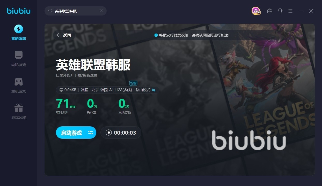 玩家可直接在其首页搜索英雄联盟韩服,找到相应的游戏即可开启一键加速。加速之后,大家再次进入游戏,可以很明显的发现延迟变低了,同时我们后续更新游戏也可以更快的完成。点击详情界面,大家还能了解当前的实时延迟状况,包括本地波动次数,如果觉得延迟过高,也可直接更换节点。除了英雄联盟韩服之外,biubiu还会为我们提供海量游戏的加速连接,光英雄联盟就有超多区服,大家都是可以一键体验的。