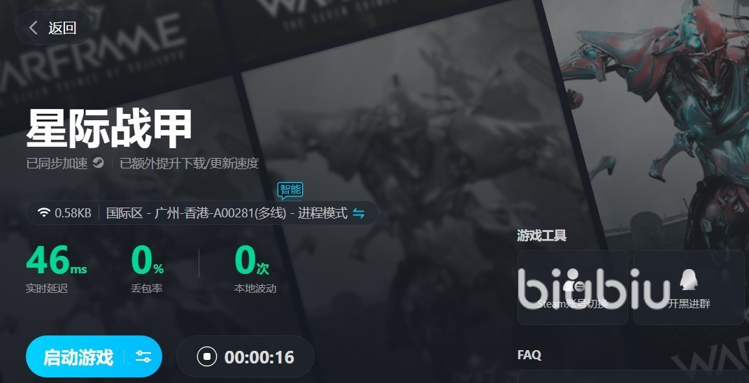 只需点击“立即加速”就会自动选择最速的节点来给游戏提速,实时延迟、本地波动也都是展示出来,让大家可以清晰了解到加速效果。在加速界面的右侧还有游戏工具与FAQ,为玩家提供便利,新人也能更轻松地上手游戏。