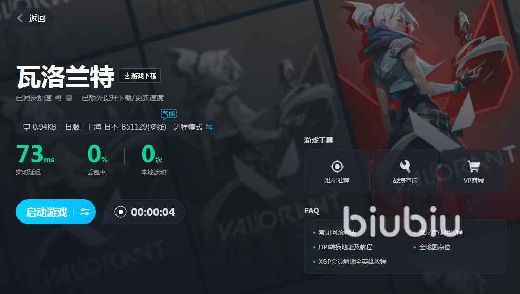 瓦洛兰特里的一些特定英雄比如死神、菲尼克斯等角色对新手特别友好,这些英雄的武器投掷节奏感明显,适合新玩家入门使用。大家在游戏里遇到的延迟、掉线、掉帧的网络问题都可以用biubiu来解决。只要一键启动就能获得流畅的网速,加速响应特别快,在眨眼之间就完成加速。