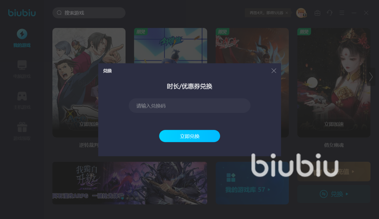 游戏的所有关卡和玩法让大家玩的不亦乐乎,但突然遇到的卡顿和掉线现象又是让人头疼的,这时候你就需要借助biubiu加速器来完成任务了,也是大家一直都极力推荐的一款加速器软件,小编自己也有在体验。还没有体验过的小伙伴可以直接点击上面的按钮来下载,首次下载的新用户可以领24小时免费时长,这是平台专门针对于新用户而推出的福利活动。当然也有平台所有用户都可以体验的活动,那就需要把【biubiu不卡顿】以小写的方式输入到对话框内,兑换成功可得三天免费时长,这样一来你拥有的免费时长就很多了。