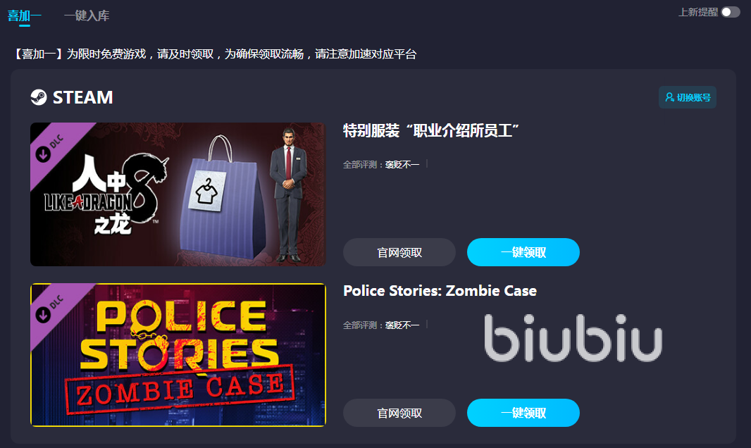 biubiu里面还有免费的steam游戏赠送给大家,大家来到游戏领取板块就能看到。赠送的游戏不定期更换,可以点击上新提醒来获得消息推送,看到感兴趣的游戏及时根据系统指引来领取,机不可失时不再来哦。