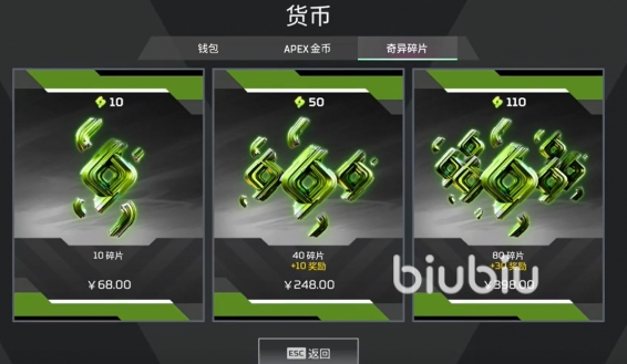 最直接的方式就是通过官方商店购买,Apex英雄的官方商店提供了多个绿币购买挡位,玩家可以根据自己的需求选择68、248、398等不同数量的绿币进行购买。当然成为EA Play的会员也是获取绿币的一个好方法,作为会员你可以享受一些额外的绿币,同时购买绿币时还能享受九折优惠。