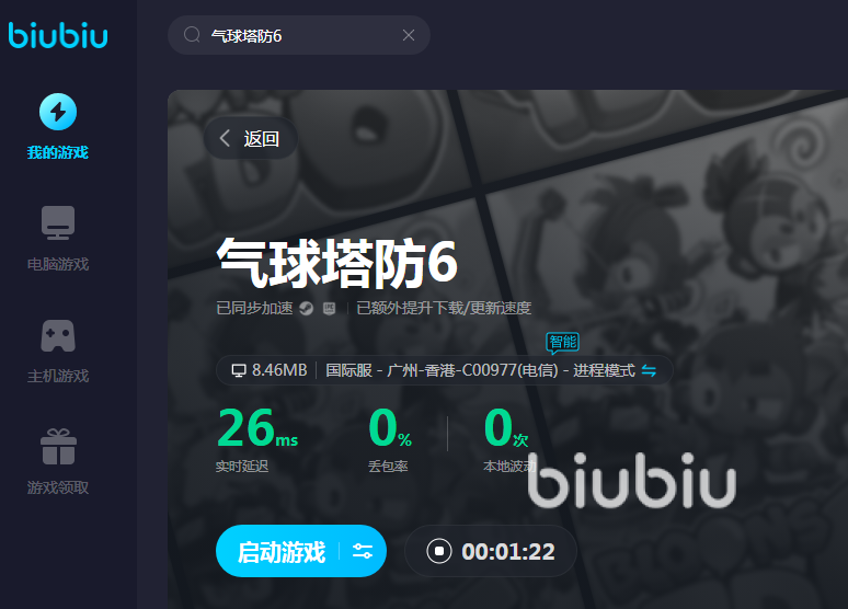 biubiu的加速效果随时都能在页面上查看,它拥有智能节点和无感切换等优势。大家想要结束气球塔防6,然后开启新的游戏,可以直接点击新游戏加速,系统会自动切换到新游戏上面,节省很多步骤,让加速更加高效。系统会自动把加速过的游戏添加到本地游戏库当中,大家如果想要找回很久没登录的游戏账号,不妨来biubiu重新加速一下,这样就能看到以前玩的是什么区服,也方便大家回忆起账号。