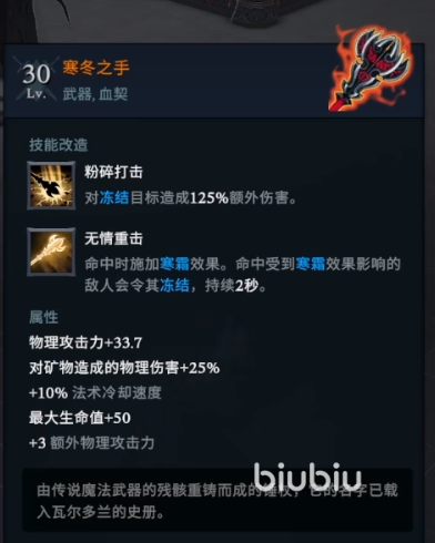 有了这把武器你可以通过“粉碎打击”,对冻结目标造成125%额外伤害。“无情重击”则会在命中时施加寒霜效果,命中受到寒霜效果影响的敌人会令其冻结,持续2秒,如果你想通过这种小控制来打断敌人的攻击,为自己创造更好的输出环境,这把武器无疑是你的首选,此外武器也会为玩家提供更快的法术冷却时间。