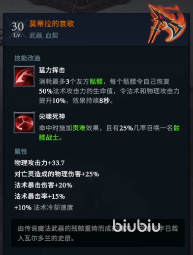 另外“尖啸死神”命中时也会施加责难效果,且有25%几率召唤一名骷髅战士。这把武器对亡灵造成的物理伤害增加25%,并且增加20%法术暴击伤害以及15%法术暴击率,更有10%法术冷却速度加成,可以说是法伤流派的毕业武器了。