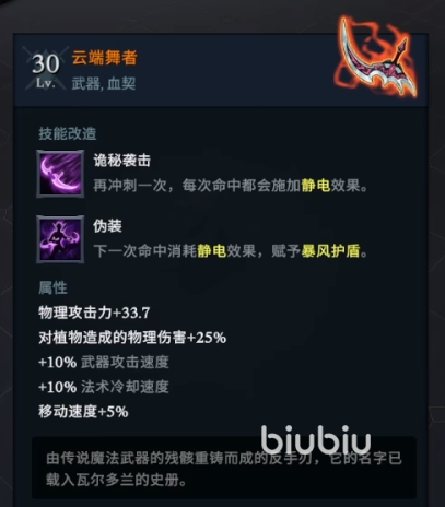 这把武器会为“诡秘袭击”再添加一次冲刺,每次命中都会施加静电效果,之后“伪装”状态下,下一次命中将消耗静电效果,并为自己赋予暴风护盾。通过这种方式不停地为自己刷盾,在持续战斗中有着不错的生存能力。给出的固定面板数据有10%武器攻击速度10%法术冷却速度,还是相当不错的。