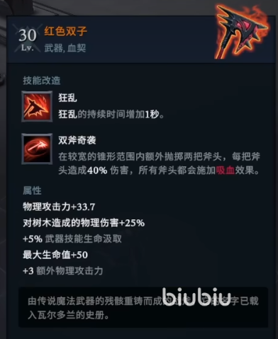 此武器会让“狂乱”的持续时间增加1秒。也会升级双“双斧奇袭”技能,在较宽的锥形范围内额外抛掷两把斧头,每把斧头造成40%伤害,所有斧头都会施加吸血效果。等于说增加了技能的吸血特性,另外面板上也增加了5%的生命汲取,你可以通过这些特性持续的治疗自己。