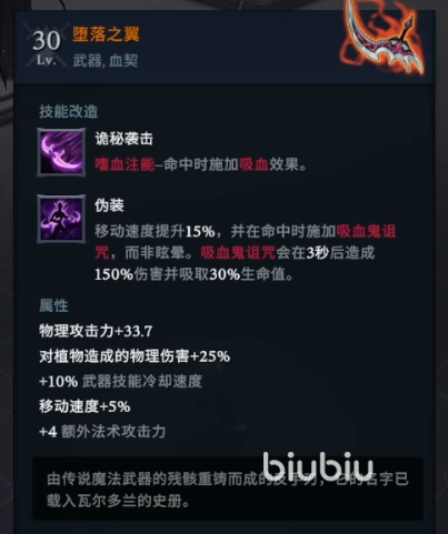 会让玩家“诡秘袭击”时的嗜血注能在命中时施加吸血效果。“伪装技能”也会升级,提供15%的移速加成,并在命中时施加吸血鬼诅咒,而非眩晕。吸血鬼诅咒会在3秒后造成150%伤害并吸取30%生命值,强大的续航能力是这件武器的特点,面板方面给的也相当可以,特别是10%的武器技能冷却。