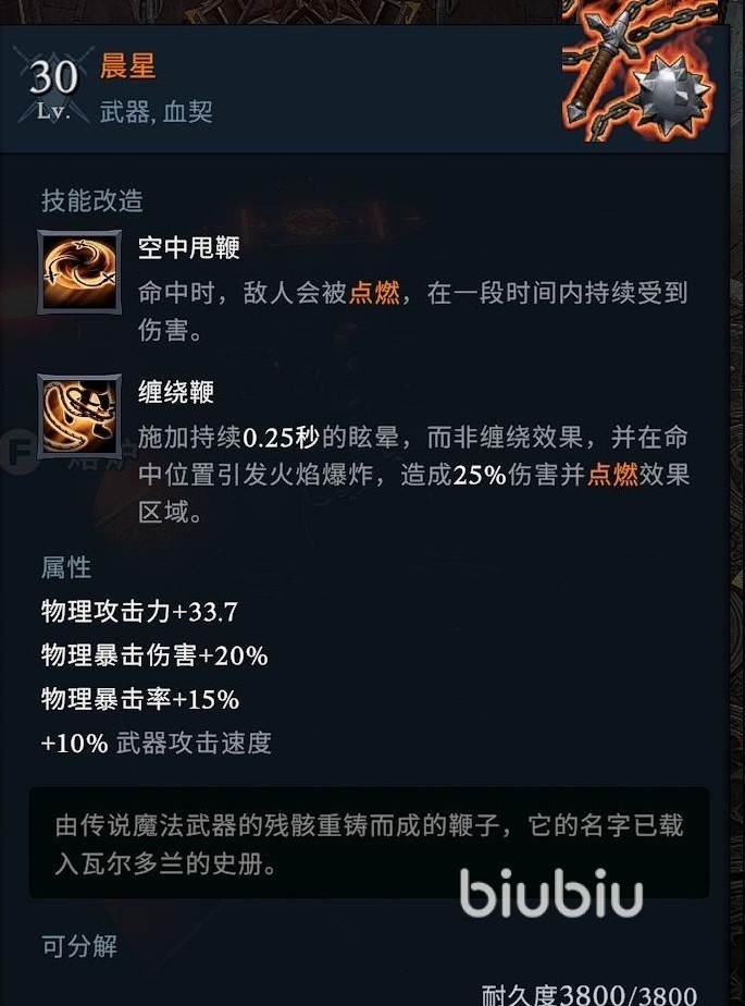 打完该boss之后就能用鞭子了,你可以通过每把武器右上角的标识来确定兵器类型,鞭子的毕业装就是这把传奇晨星,高面板并且增加双暴。另外还可以点燃,眩晕甚至产生火焰爆炸效果,有着极高的输出表现。