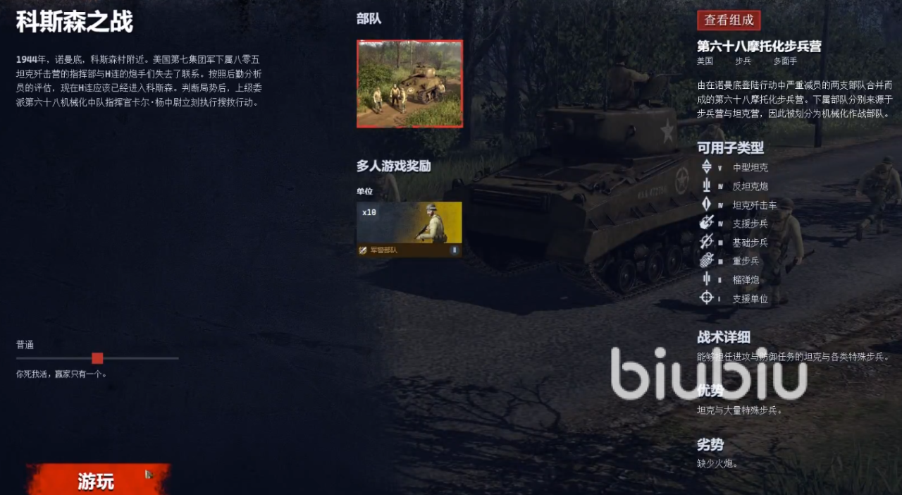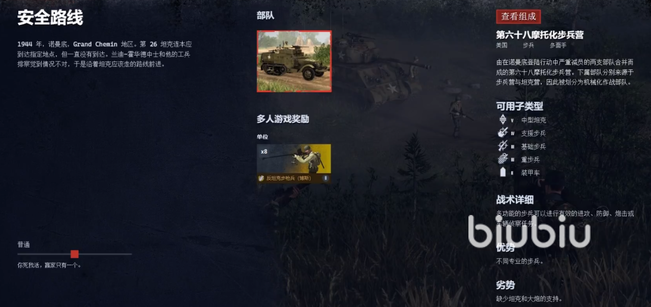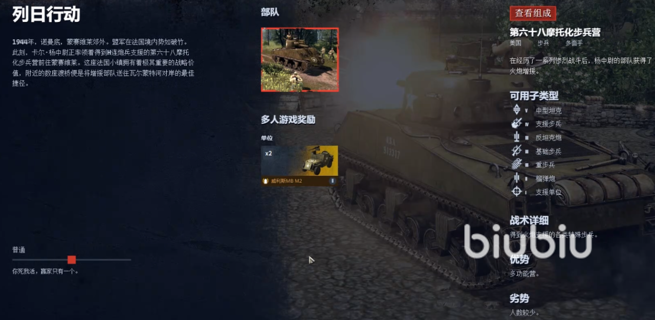 第三小节讲的是诺曼底蒙赛维莱郊外,盟军在法国境内势如破竹。此刻卡尔中尉正率领着得到H连炮兵支援的第六十八摩托化步兵营前往蒙赛维莱,这座法国小镇拥有着极其重要的战略价值,附近的数座渡桥便是将增援部队送往瓦尔蒙特河对岸的最佳捷径。