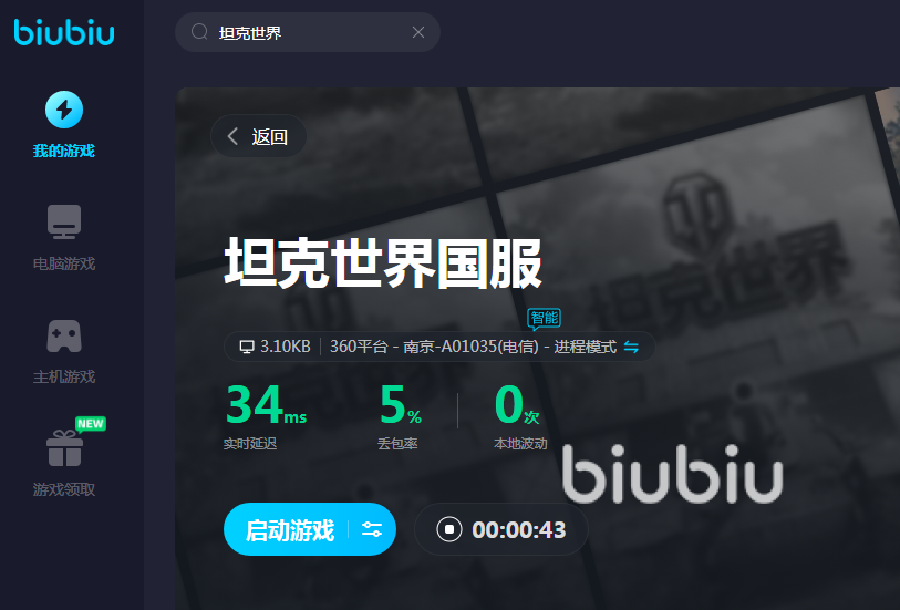 坦克世界容易闪退跟游戏网络不稳定有关,解决这个问题其实只需要一个biubiu软件就可以了,点击上方按钮就能获取它的下载链接,成为biubiu新用户还能自动领取24小时免费加速权限。与此同时,新老用户还能凭借兑换码【biubiu不卡顿】再享受到3天免费加速时长,大家就可以尽情体验加速后的畅快的游戏网络了。