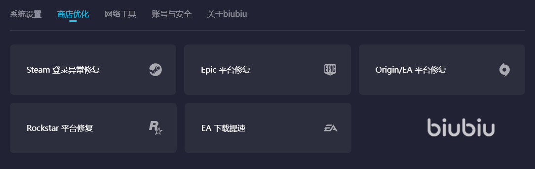 同时biubiu还有全面的工具帮助大家进一步提升电脑性能,改善电脑网络故障等问题。它拥有商店优化和网络工具两种功能,其中商店优化主要用来修复EA、steam等游戏平台登录异常的情况,网络工具则可以进一步重置电脑网络,卸载无效的虚拟网卡,改善用户的电脑网络环境。
