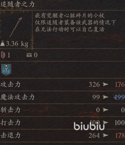追随者之力是一把法师用的法杖,镶嵌着觉醒者的心脏碎片,在前期可以带来400点的魔法攻击力加成,属性加成还是挺不错的。