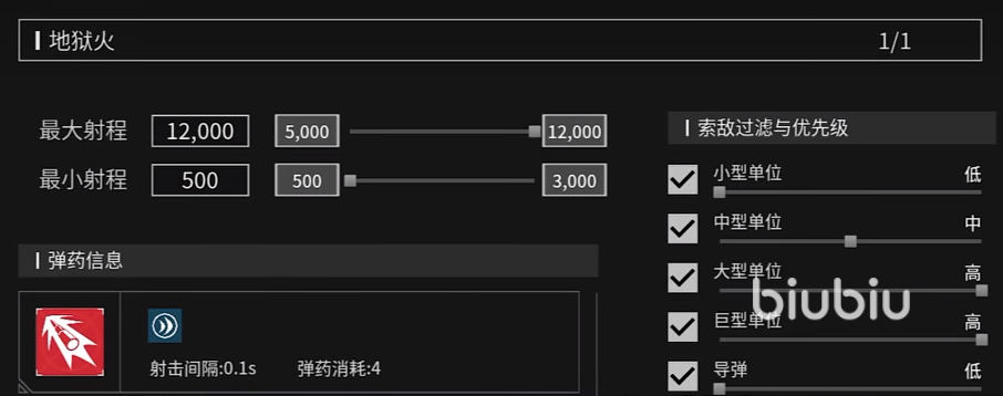 这个炮塔属于一整个火力系统,是由近防炮改装而来,针对近程的敌人还是很好用的。点开之后是可以对它的射程进行修改的,最低射程在500-3000之间,最远距离可以调配到5000-12000之间,那肯定是选择最远的用了。另外过滤目标也可以挑选,考虑到实际使用效果一般都会全部勾选,优先级大家可以自行调整,推荐把大型单位优先级调高。