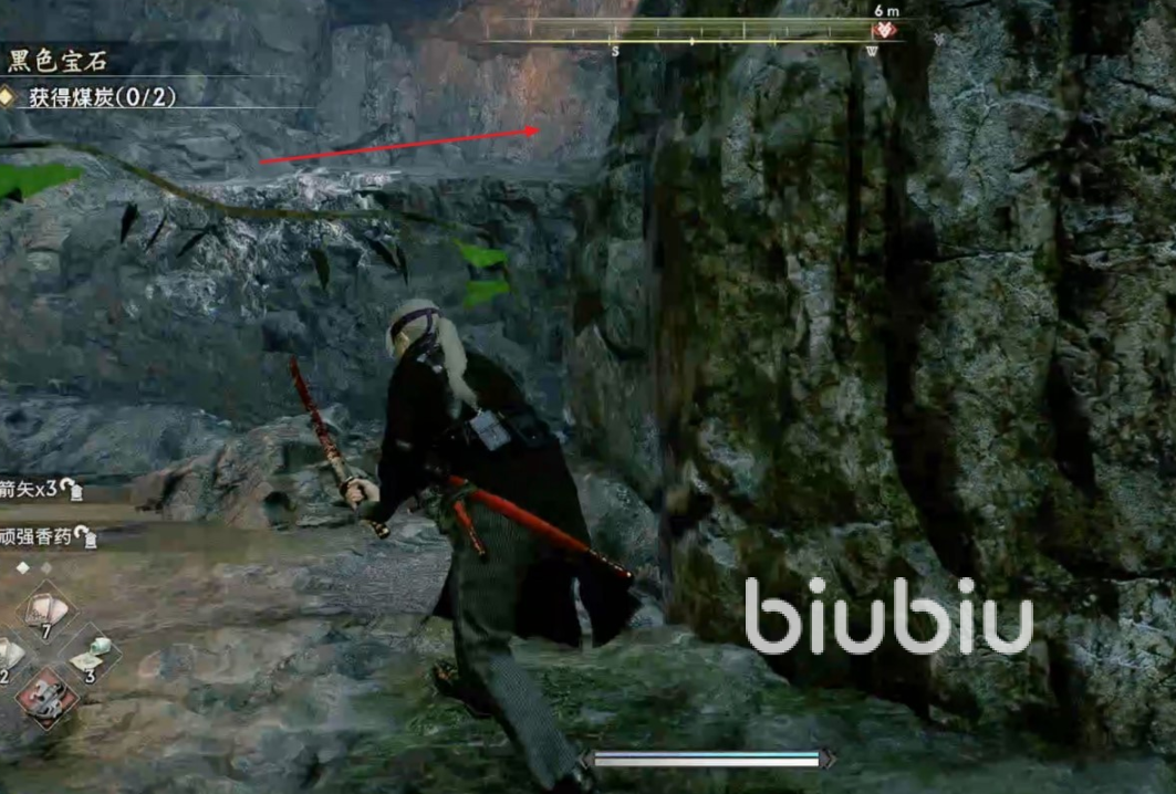 然后,按照指示向右前方的洞口走。你会看到两边都有路,此时需要从左边跳下去以收集到第二个煤炭碎片。之后,你会看到一个涂有白色油漆的岩石台阶,需要往上爬并一直往里走。在通道的尽头处,你会发现一个宝箱,开启宝箱后,继续往下跳并一直向前走。