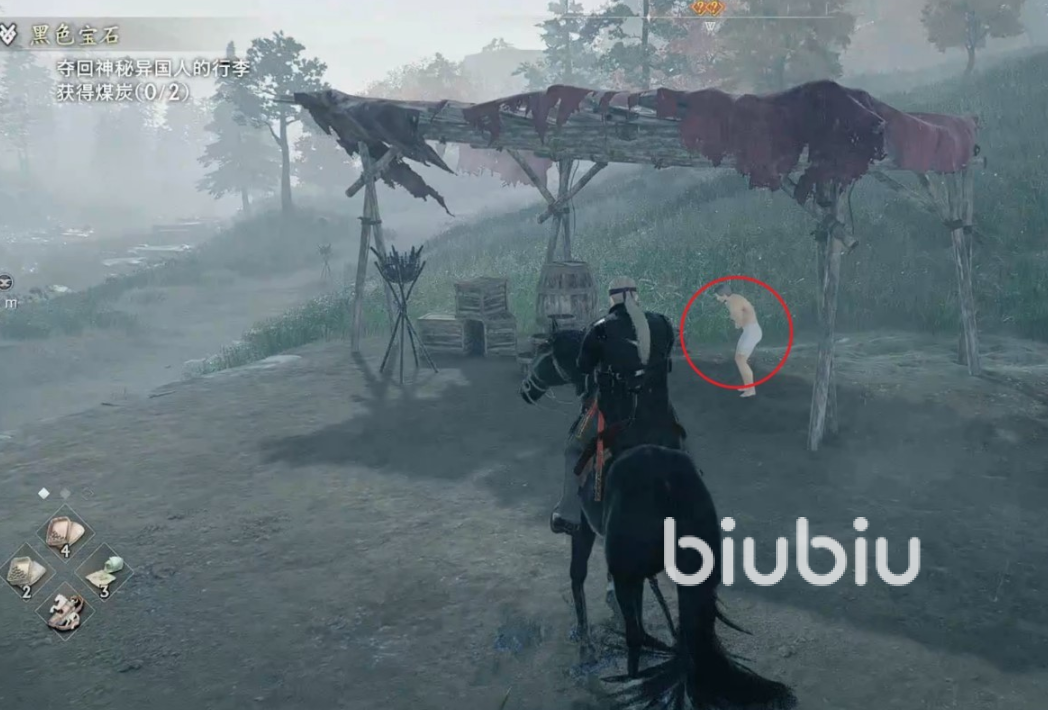首先,前往下图中的位置,与路边没穿衣服的外国人对话接取任务。从对话可以了解到这个外国人被一群歹徒抢劫了,想让我们帮他拿回行李。接下来,根据任务指引前往洞穴的位置。进入洞穴后,你需要先清理掉入口处的敌人。在右侧岩壁旁边,你可以采集到一个煤炭碎片。