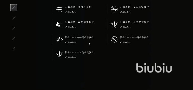 此外玩家还能通过修习内功来获得更多的额外被动特性,游戏中的内功秘笈可以在挑战中获得。在测试版本中可以看到挑战(或者通俗的说是副本)一共有六个,其中装备和武器是概率获得,秘笈是自选得到,还会有两种游戏代币产出,分别用来兑换和购买物品。此外游戏的剧情以及野外也会有一些强大的BOSS,他们也会掉落不同的物品或者素材,如何才能更有效率的击败对手呢?除了了解敌人的攻击模式之外,你更需要学会使用招架,在对手攻击判定生成的瞬间,进行招架就能化解伤害并大幅削弱敌人的真气条,其思路和《只狼》比较像,另外不同的BOSS对于不同武器的抗性也略有区别,你可以跟据这一点选择更合适的武器发起进攻。