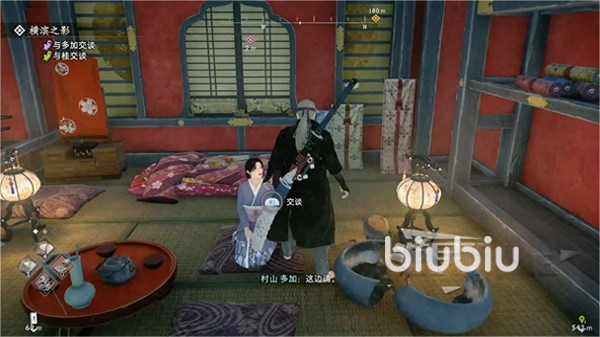 第一步是接取任务,其实横滨之影的任务可以在两个不同的地方领取,游郭的多加和樱屋的桂都可以接,但是需要完成的任务内容没有什么差别,只是在细节上有不一样的地方。