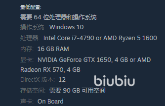 它的配置要求可以分为最低配置和推荐配置两类,最低配置需要满足64位的Win10操作系统,CPU得满足四代I7或者R5 1600,运行内存得达到16GB,显卡为显存4GB的GTX1650或者RX570,内存则需要硬盘空间剩余90G,如果以上条件都满足的话,那我们就能以最低特效进行游玩了。