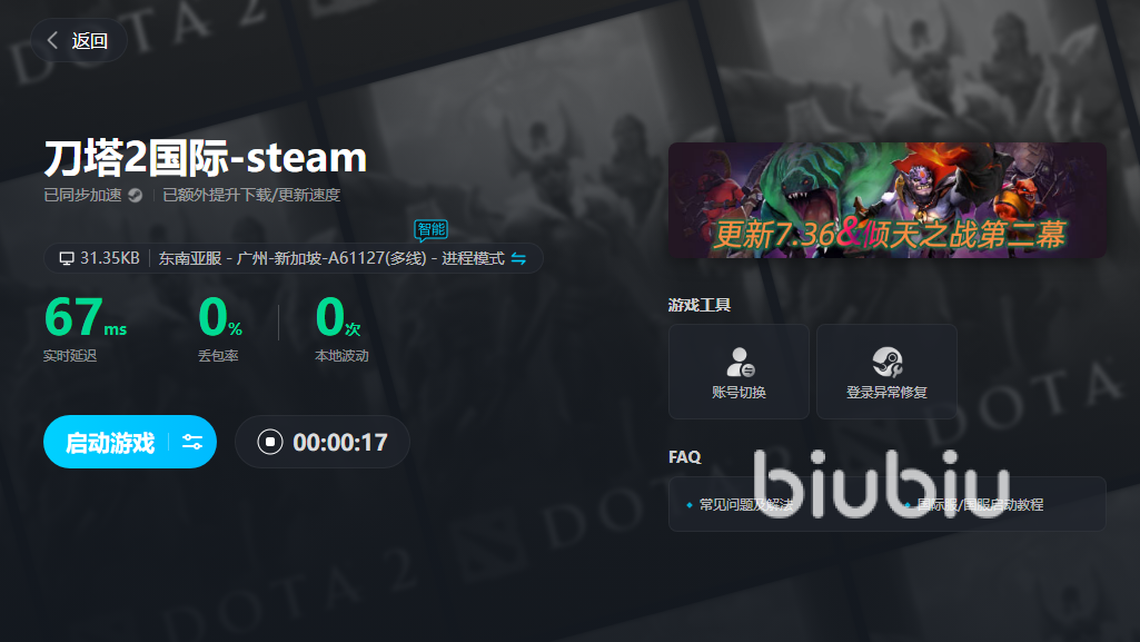 玩家基本上玩的时候使用的是Steam平台,这个平台最常见的问题就是用的时候网络很容易不稳定,这就导致每次在对线或者团战的时候,时不时的出现卡顿问题,导致发挥比较差。但是biubiu起效之后,网络的延时状态就会被优化,延时变低之后随之而来的就是游戏流畅度的提高,帧率的改善,让技能的释放以及走位的移动变得更加精准,自然可以提高操作者的水平以及表现。