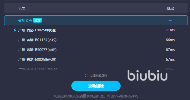 另外biubiu还有个优点,它利用智能节点自动优化玩家网络的同时,也提供了手动选择的余地,玩家可以自己选择用哪个地区的哪条分线节点来进入游戏,不管是广东区还是上海区的都可以。有了这些助力,玩家很快就能将自己的角色发育起来做到学有所成,进入好玩的中后期,可以挑战更多的关卡,直到顺利的通关了。
