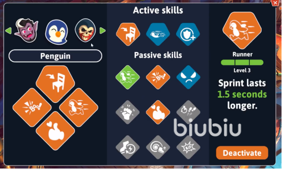 我们进入游戏后,会站在一个大厅,在大厅的正上方是换外观的衣橱,上面会写着“Skins”,我们需要使用游戏内的货币才能购买。在它的左边是“Level Up”,也就是技能点,点开会发现一共有四个技能栏,分别是企鹅(平民)和三个猎人。每一个对应的技能都不一样,比如企鹅的第一个技主动能就是变身,可以在躲藏的过程中变成伪装物,躲过猎人的搜查。第二个主动技能是往前冲刺,在猎人靠近自己的时候,加速逃离。每一个角色最多可以带4个技能,所以我们还可以选择三个被动技能进行搭配。