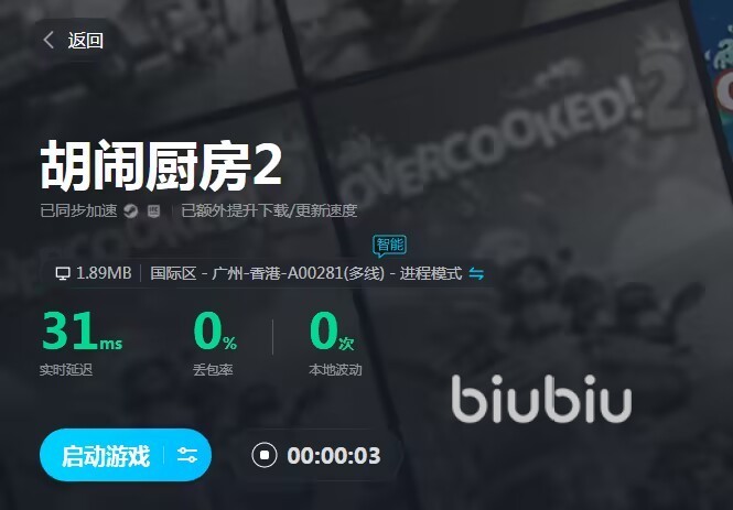 同时biubiu的适用范围和兼容性就很广,它有专门针对胡闹厨房2的加速专区,不仅可以一键连接专线加速,还有该游戏的攻略社区供玩家参考和讨论。当然了biubiu还可以匹配上千款游戏的加速,这样其他的游戏你也不用担心加速问题了。