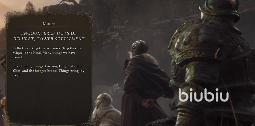 以上就是艾尔登法环黄金树之影摩尔个人资料简介,作为前中期重要的一个线索人物,除了能够让我们顺利通关任务外,各式各样丰富的物品我们也能再次购买,所以大家来到塔之镇贝瑞特的时候,需要再第一时间找到他并和他建立联系。另外他还有一个好朋友安斯巴赫,为了后续剧情的顺利推进,大家遇到的时候记得也去跟他对话一下哦。
