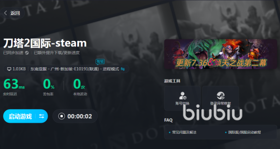 那么一款好用且稳定的加速器就必不可少了,推荐可以试一试biubiu加速器。它有着稳定的网络加速,保证小伙伴们在游玩刀塔2国际服时,不会感到游戏卡顿,同时可以降低延迟率,让玩家们顺畅体验和敌人对抗的乐趣。尤其它适用于多种国际服游戏,并且还有刀塔2的加速专区。