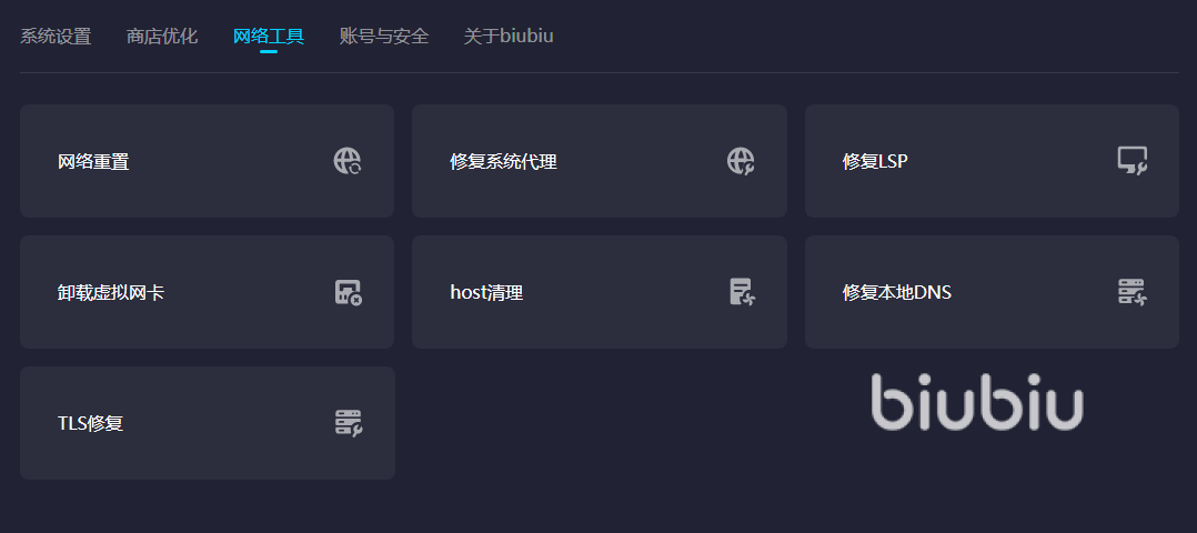 大家先用biubiu工具来优化一下电脑网络配置,想要修复网页打不开、游戏打不开、网络限速等问题都可以,还有专门的工具来修复游戏平台登录异常,多个方面考虑用户的需求,带来全方位电脑网络优化服务。