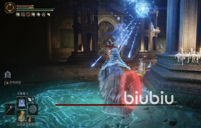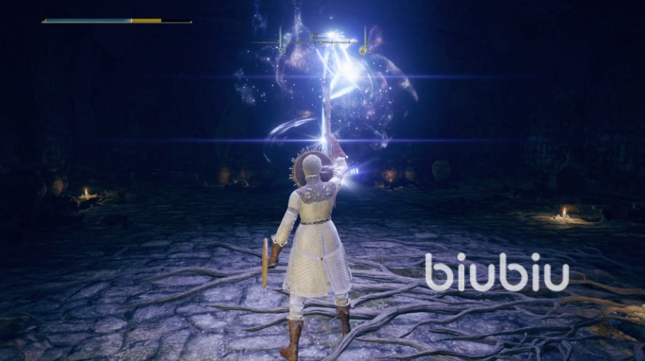 除了这些小法术,你也可以带一些不错的高阶魔法来对付精英怪,比如奔放结晶就比较适合秒杀这类大型也怪,短暂蓄力后持续的向目标投射结晶碎片,造成不错的爆发伤害,这个法术在击败BOSS“结晶三人组”后就能直接解锁。如果你懒得找他们也可以选择别的高阶法术,比如蕾拉娜的满月或者菈妮的暗月,前者打败满月女王就有,后者走群星任务线也能直接拿到,技能效果会向前方投射一个法术月亮,造成大量输出,足够在大世界横着走了。