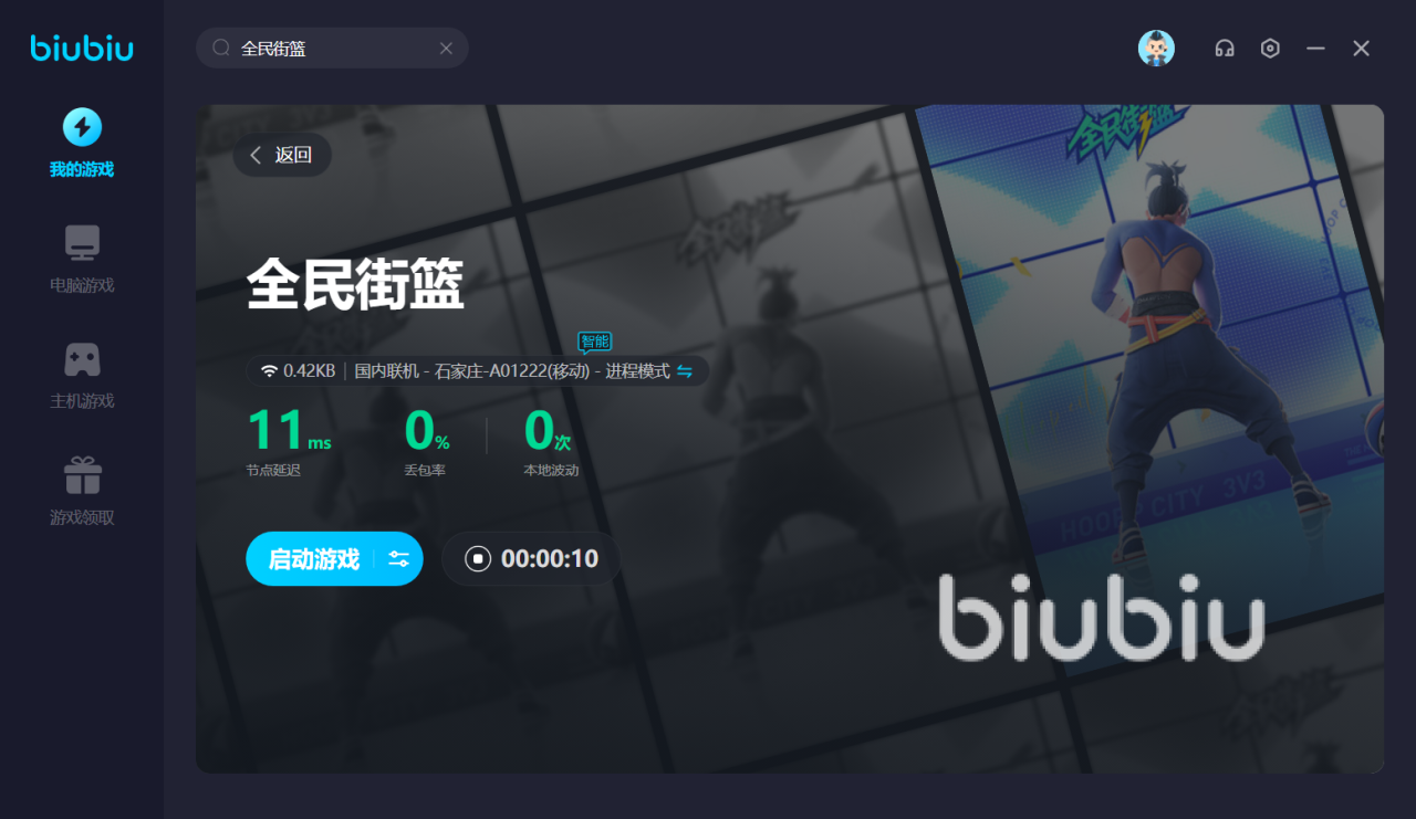 在使用biubiu加速器对全民街篮这个游戏进行网络加速的时候,用户只需打开软件,它就会自动检测用户设备上已安装的游戏,小伙伴们只需找到想加速的游戏点开,就可以一键开启biubiu带来的网络加速服务。