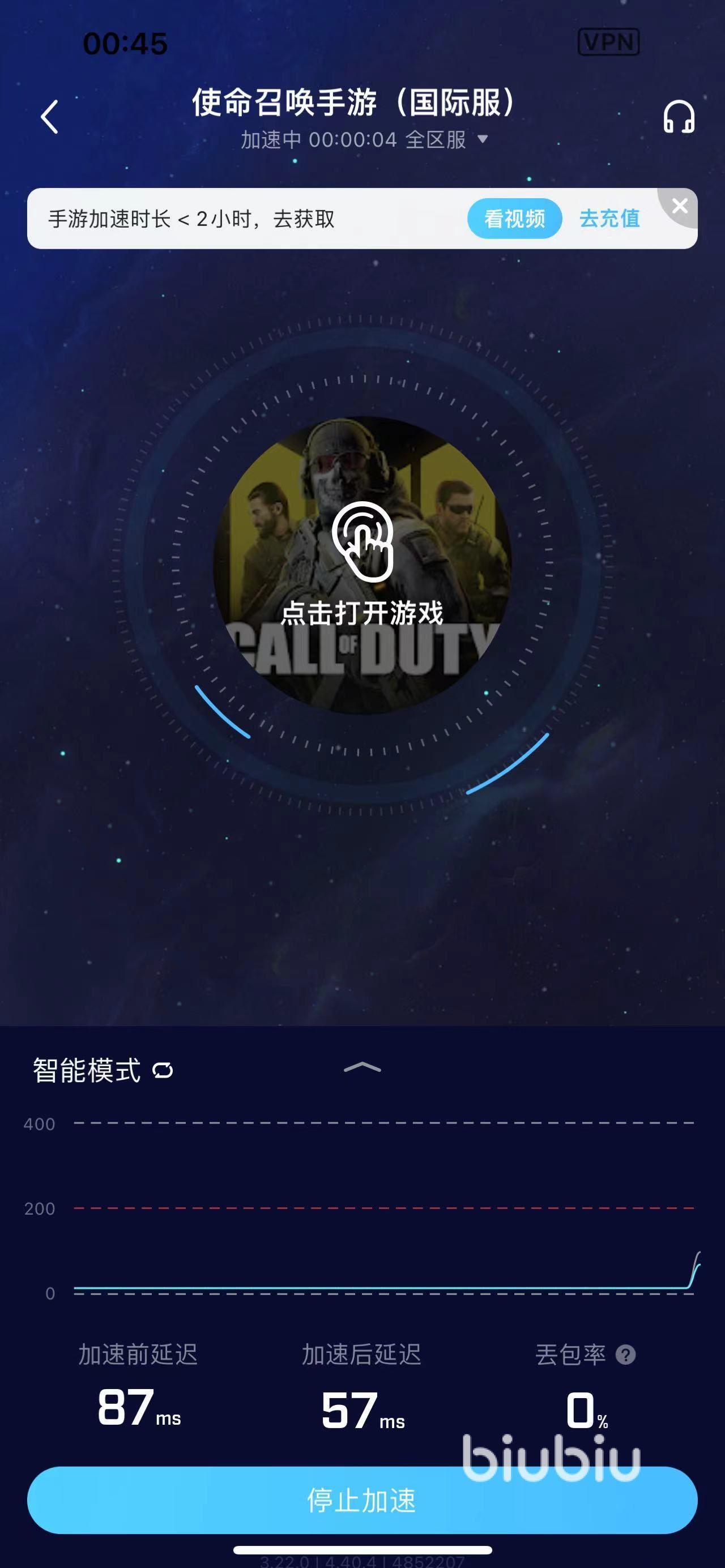 使命召唤手游国际服毕竟是款高人气游戏,所以时常出现卡顿的情况。这时大家可使用biubiu进行提速,加速过后方能让你流畅地登录游戏并成为里面的一员。此外,大家可以通过观看视频领取免费时长。就算是学生党亦可无忧加速,让你随心畅玩各种游戏。若是游戏途中延迟高的话,那就不能顺利地瞄准敌人,并且会错过良好的开枪时机。有了加速器后,便可准确地射击,让你弹无虚发,才能千里之外取敌人首级。