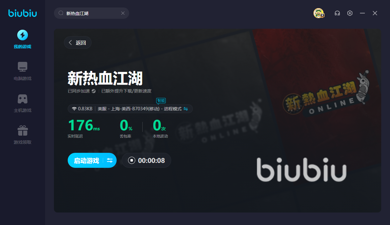新热血江湖虽然是款武侠风游戏,但却暂时没有国服。为了进入新的江湖里边,大家就得使用biubiu。获得极品网络后,即可成功变为一名武侠高手。若是打算试玩一波,新用户则可领取24H的免费加速;另外新老用户可输入【biubiu不卡顿】,额外享受三天免费加速。在行侠仗义的途中卡顿的话,很容易被对手反杀。有了加速器之后,就能让你勇敢地做出见义勇为的事情,毕竟网络不再卡顿了。