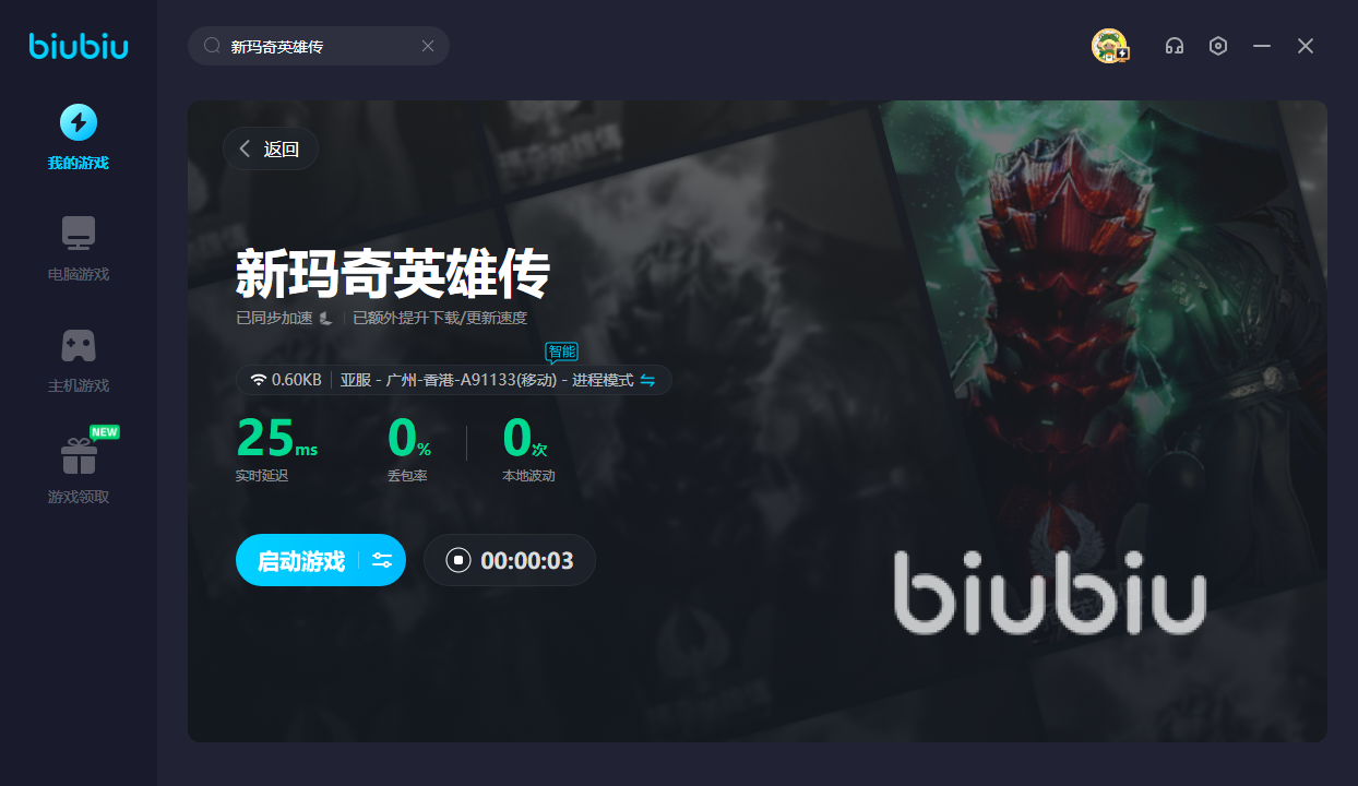 由于新玛奇英雄传属于海外游戏,现在仍旧未有国服。要是想进入这片全新的世界并开启新的故事,就要使用biubiu。即可获得好的网络环境,让你顺利开启新的故事。若是想试试能不能玩的话,新用户可领取24H的免费加速。另外新老用户可使用【biubiu不卡顿】,即可畅享三天免费加速。因为该游戏属于动作类型,所以一卡顿的话就会让你很难玩下去。好在加速器即可优化网络,轻松告别卡顿,让你灵活走动,并享受这一草一木的珍奇画面!