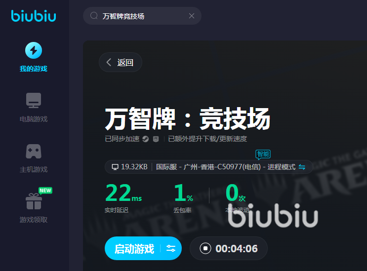 接下来找到游戏以后点击一键加速,有智能节点来启动非常方便,加速成功以后用户随时都可以在页面看到流量变化。biubiu还给万智牌竞技场额外提升了下载速度,当游戏需要更新的时候大家就不用等那么长时间了。