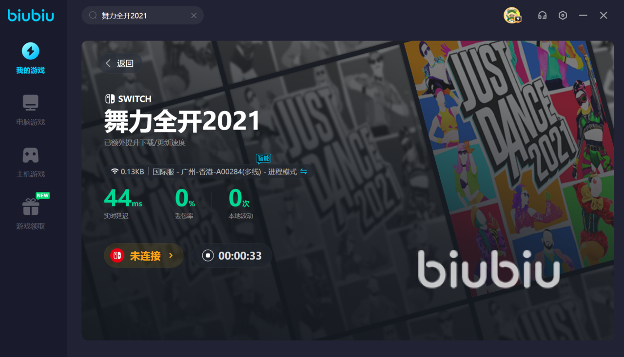 舞力全开游戏中有很多的曲目,这些曲目的演奏难度基本上是不同的,一般新手挑战简单的舞蹈就可以获得较高的评分,而一些节奏较快的舞蹈,需要玩家的手速才能达到较高的评价,尤其是跟其他玩家进行舞蹈pk的时候,对于手速以及网络的要求是比较高的,但是部分玩家在跳舞的过程中老是卡顿,这使得一些键位根本点不到,导致舞蹈分数直线下降,而为了避免这种情况使用biubiu加速器是比较好的,并且新人在注册后便获24小时免费加速,以及新老用户使用兑换码【biubiu不卡顿】可获3天免费的使用权哦!
